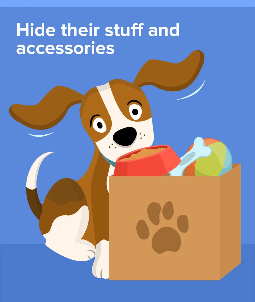 Remember that your pet's accessories are not part of your home staging, no matter how adorable they look (Yes, even those cute socks and holiday costumes!). Even potential buyers who are pet lovers won’t be impressed and will likely see them as clutter. So those collars, leashes, toys, food, food bowls, and pet beds need to be put away— make sure to clean them before stashing them away in a cupboard or closet.